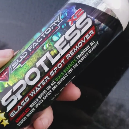 Sud Factory Premium Detail Products Spotless X2 is the world-champion water spot remover that is formulated with unique properties to obliterate the toughest stains designed for all glass surfaces including windows on the home, cars, boats, appliances, shower glass doors, and more.