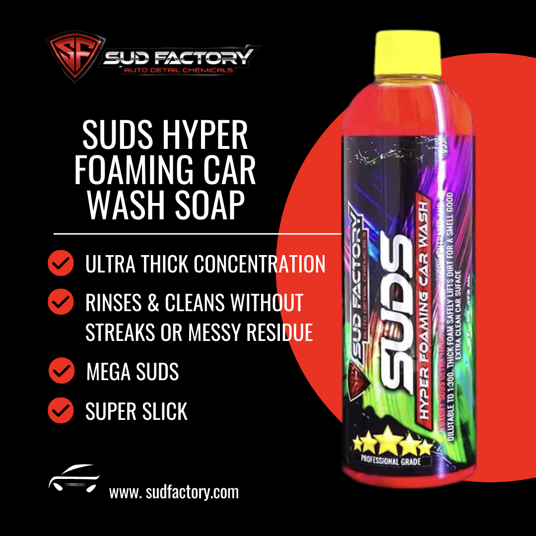 Sud Factory SUDS is a hyper foaming car wash soap that produces the best soap suds that are thick and frothy to encapsulate dirt and grime for a quick and simple way to remove contamination build-up for a clean surface.